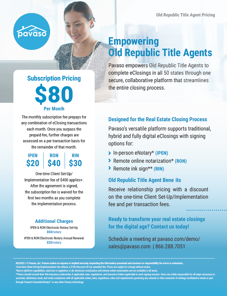 As a leader in digital mortgage transformation, Pavaso empowers title companies and real estate attorneys to complete eClosings in all 50 states through one secure, collaborative platform that streamlines the entire closing process.